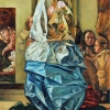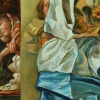 The background of the painting is rich in details: on the right are women and children who are watching what is happening, expressing curiosity or reflection. On the left, you can see a reflection or another artistic fragment, filled with natural motifs and human figures. Their soft forms contrast with the more expressive, sharp folds of the central composition.