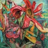 This painting is executed in an expressive manner, using thick brushstrokes and bright colors. The central place is occupied by a large red flower with dynamically curved petals, creating a sense of movement and energy. The warm palette - rich reds, yellows and greens - fills the painting with vitality, and the impasto technique of painting gives it texture and volume. The background is executed in a mixture of cold and warm tones, creating a contrast that emphasizes the main elements of the composition. The painting conveys a sense of the wild riot of nature, its fragility and simultaneous power.