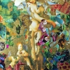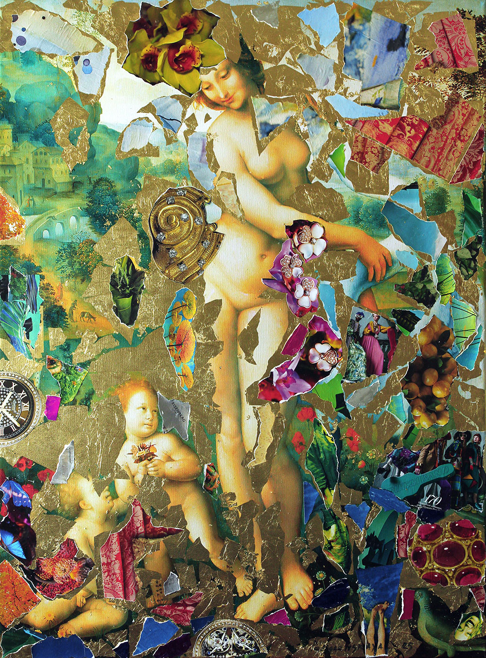 However, the image seems to be “broken” into fragments: it is covered with torn pieces of other paintings, photographs and decorative elements, including gold patterns, precious stones, watches, textiles and natural motifs. The combination of such heterogeneous materials gives the work a multi-layered effect, creating a semantic play between the classic and modern perception of art.