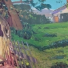 Behind the fence, a green meadow bathed in sunlight unfolds. The grass is painted in bright, saturated shades of green, creating a feeling of lushness and freshness. Small strokes and painterly spots imitate the movement of the grass in the wind, giving the landscape dynamism and liveliness.