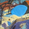 At the center of the composition, dominating the landscape, is a gigantic, perfectly smooth bright blue spot. This element, located in the middle of the snowy space, serves as the main source of energy and surreal tension in the painting. It might be a huge melting ice mirror or simply an abstract color accent symbolizing the vast depth of the spring sky that has «fallen» to the earth.