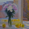 Композиция построена вокруг окна, из которого открывается вид на осенний городской пейзаж. Перед окном на подоконнике расположились предметы, символизирующие прощание с летом и наступление холодов. Главный акцент — пышный букет хризантем в прозрачной вазе. Белые и нежно-розовые цветы создают ощущение свежести и красоты, которая продолжает радовать, несмотря на увядание природы за окном.