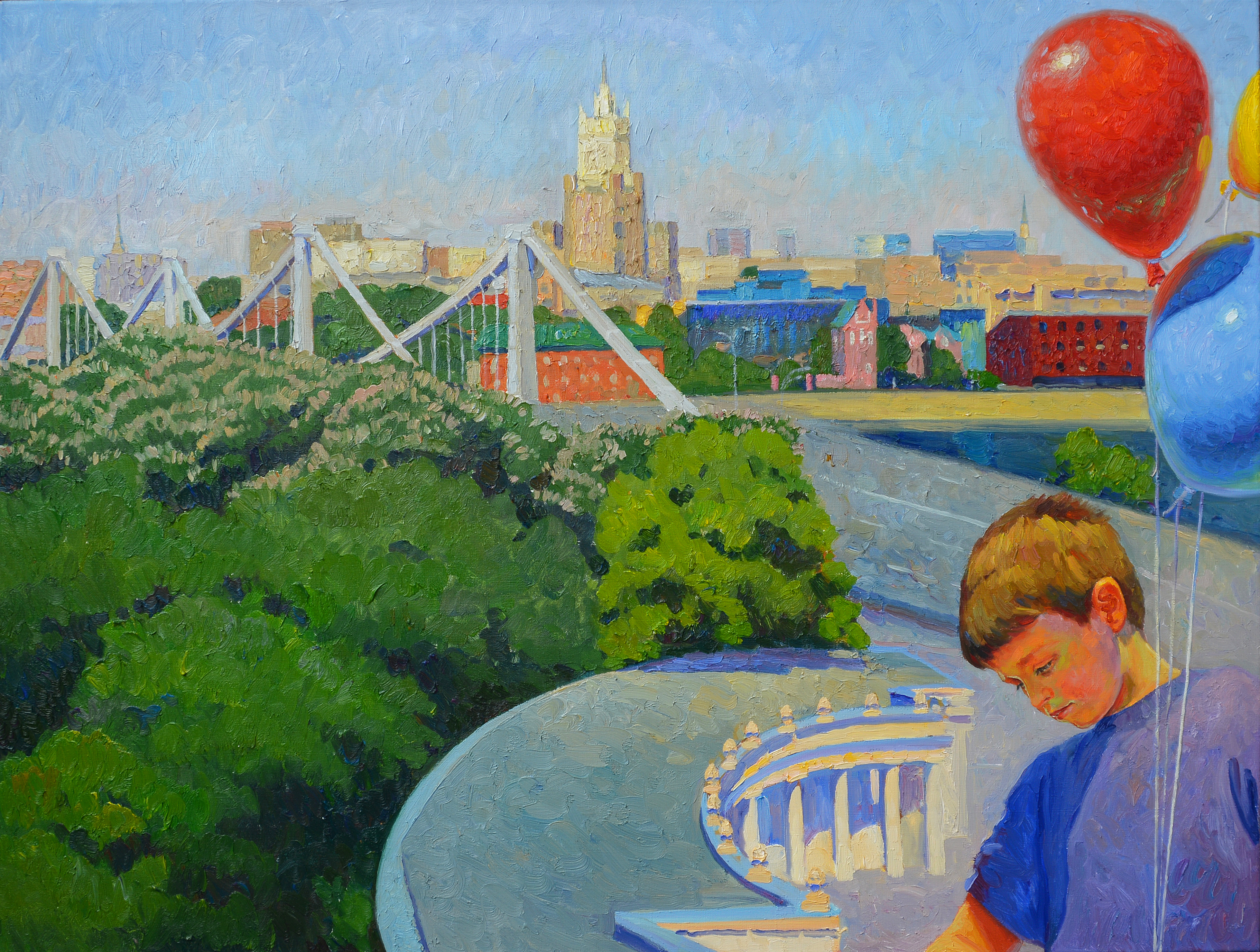 Композиция удачно сочетает городской пейзаж и жанровую сценку. На переднем плане справа виден ребенок, мальчик, увлеченно смотрящий вниз. Его фигура, написанная в ярких синих тонах, придает картине ощущение движения и любопытства. Рядом с ним, в правом верхнем углу, парят воздушные шары, которые сразу же ассоциируется с праздником, радостью и беззаботным детством.