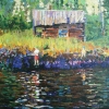In the foreground, you can see two children keen on fishing. Their figures enliven the composition, adding dynamics to it and creating a warm, nostalgic mood. Shades of purple, blue and green give the painting depth and richness, emphasizing the natural beauty of northern nature.