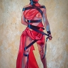A distinctive feature of the painting is the contrast between red and black colors. The red fabric, symbolizing passion, energy, and life, seems to oppose the black ribbons, symbolizing restrictions, prohibitions, and death. This contrast emphasizes the heroine’s inner conflict and her contradictory attitude toward freedom.