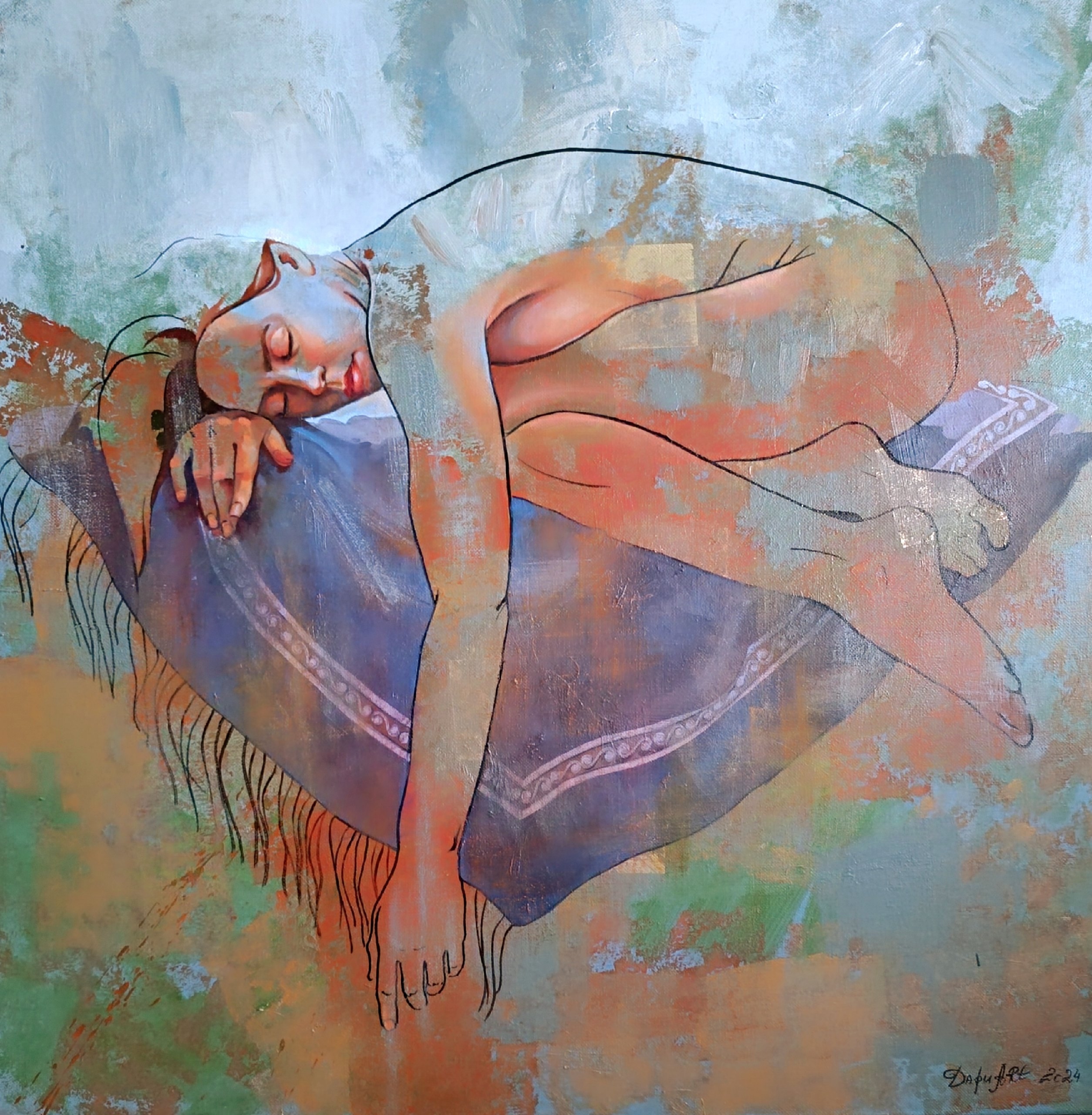 The painting by DariArt «Emptiness» is a complex and multifaceted piece in which the artist explores themes of loneliness, alienation, loss of meaning, and the pursuit of peace through sleep or surrendering to reality. Using a muted color palette and a technique that balances between realism and abstraction, she creates an atmosphere of melancholy, contemplation, and a certain mystery characteristic of the moment when a person confronts the emptiness within themselves and tries to find comfort or explanation in it. It is not just an image of a sleeping woman, but rather a visual embodiment of a soul seeking peace and harmony in a world devoid of meaning and hope.