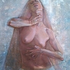 At the center of the canvas is a naked female figure, seemingly frozen in a moment of emotional shock. Her pose, expressing pain and despair, speaks of an inner conflict and struggle with her own feelings. Her hands pressed to her throat and chest seem to try to stop the flow of emotions, to hold back a scream and silence the pain.