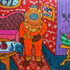 At the center of the composition is a diver in a bright orange suit, which immediately draws attention. His appearance in what seems to be an ordinary interior creates an effect of surprise and absurdity. The contrast between his massive figure and the delicate interior items—a round table with fruit and a bottle, a painting on the wall—emphasizes the surreal nature of the work.