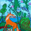 The composition is quite dense, with many figures placed on different planes, but without deep perspective. The animals, plants, and trees are depicted in a stylized manner, with exaggerated features: the fox’s huge teeth, the cat’s bulging eyes, the monkey’s long limbs. This gives the work traits of grotesque and caricature. The trees and plants in the background form something like a theatrical set, and the arrangement of the figures creates a sense of action, as if it were a frame from a cartoon.