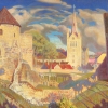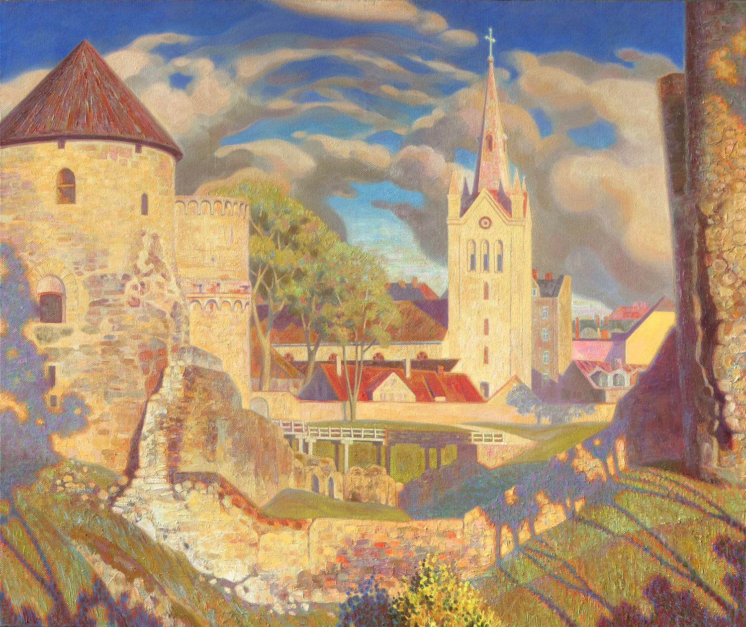 В центре внимания полотна — архитектурный ансамбль, состоящий из старинного замка и готического собора. Их строгие формы, выполненные в светлых тонах, контрастируют с окружающей природой, создавая ощущение величия и неприступности. Художник тщательно прорабатывает детали архитектуры, передавая фактуру камня, изгибы арок и устремлённые в небо шпили, создавая ощущение реалистичности и присутствия. Замок и собор словно являются символами истории, веры и связи с прошлым.