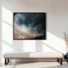 The art work presents a dramatic panorama of the sky, with heavy, leaden clouds dominating the upper composition. They presage an impending storm and evoke a feeling of heavy anxiety. However, amidst the gloom and chaos, glimmers of hope emerge: pastel hues of pink and white illuminate the clouds, as if to remind us that even the darkest night must give way to dawn.