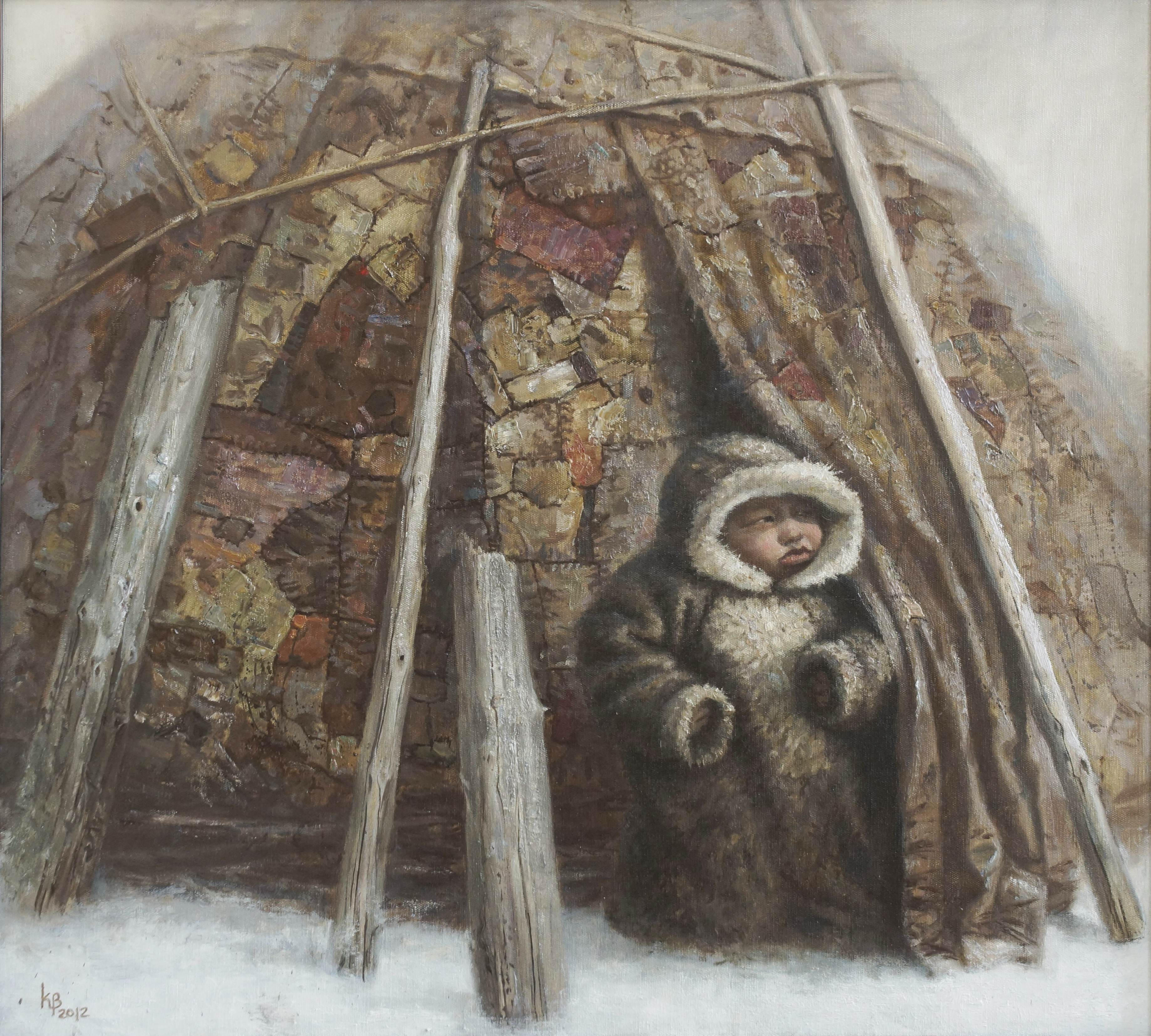 Маленький ребёнок, одетый в тёплую меховую одежду, привлекает внимание своим невинным и чистым взглядом. Его открытое и любопытное лицо выражает надежду на будущее. Он стоит на пороге юрты, словно готовясь шагнуть в «светлый мир», который ждёт его за пределами жилища.