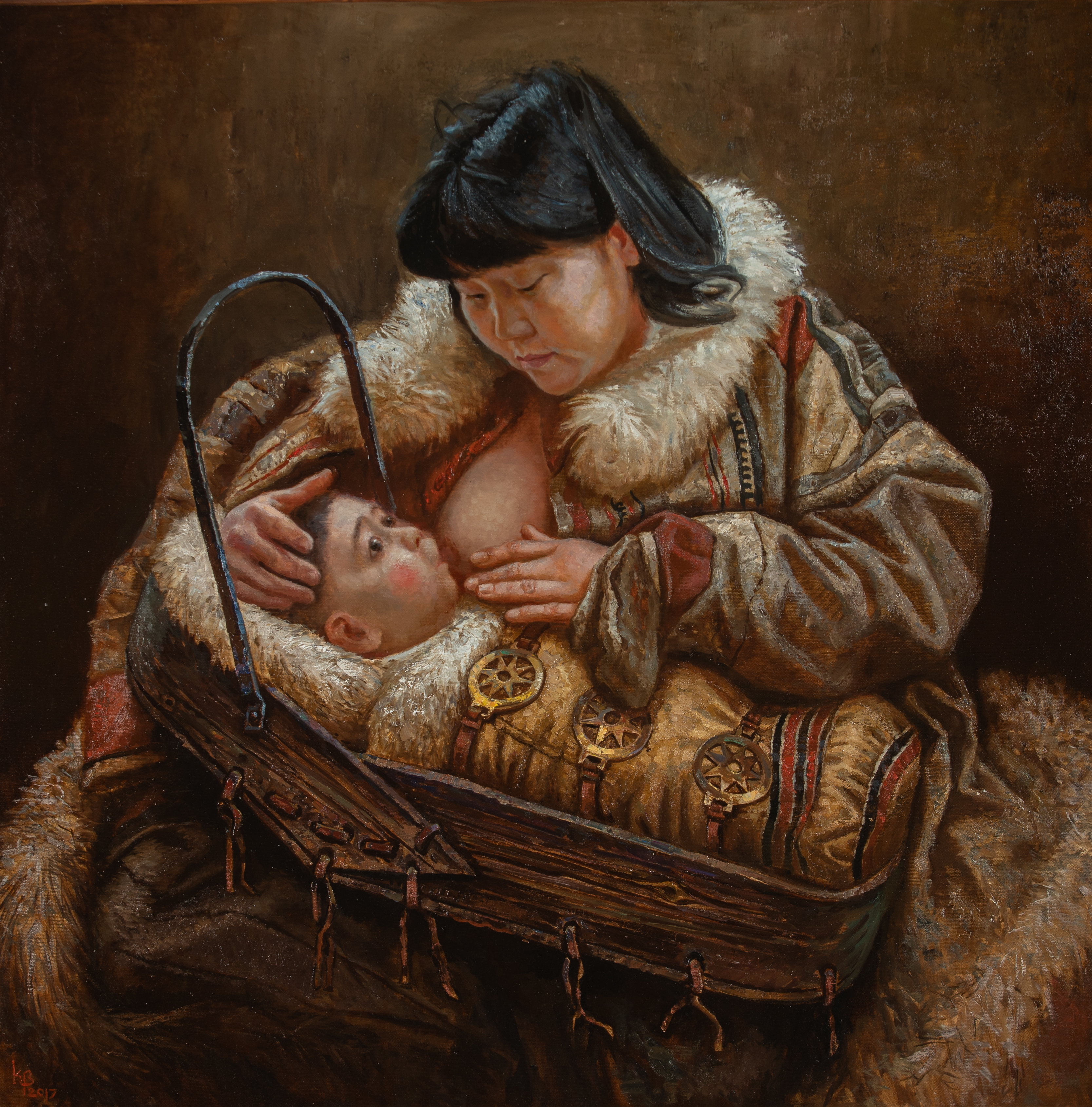 Младенец лежит в колыбели, украшенной традиционными северными орнаментами и оберегами. Эти детали придают картине особый колорит и подчёркивают связь с древней культурой коренных народов Севера. Колыбель — словно символ защиты и оберега, созданный матерью для своего ребёнка.