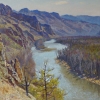 Горы, возвышающиеся по обеим сторонам реки, выглядят могучими и незыблемыми. Их скалистые вершины, освещённые солнцем, контрастируют с тёмными ущельями, создавая эффект объёма и глубины. Художник использует охристые, коричневые и серые тона, чтобы передать фактуру камня и земли, а также подчеркнуть их древность и мудрость.
