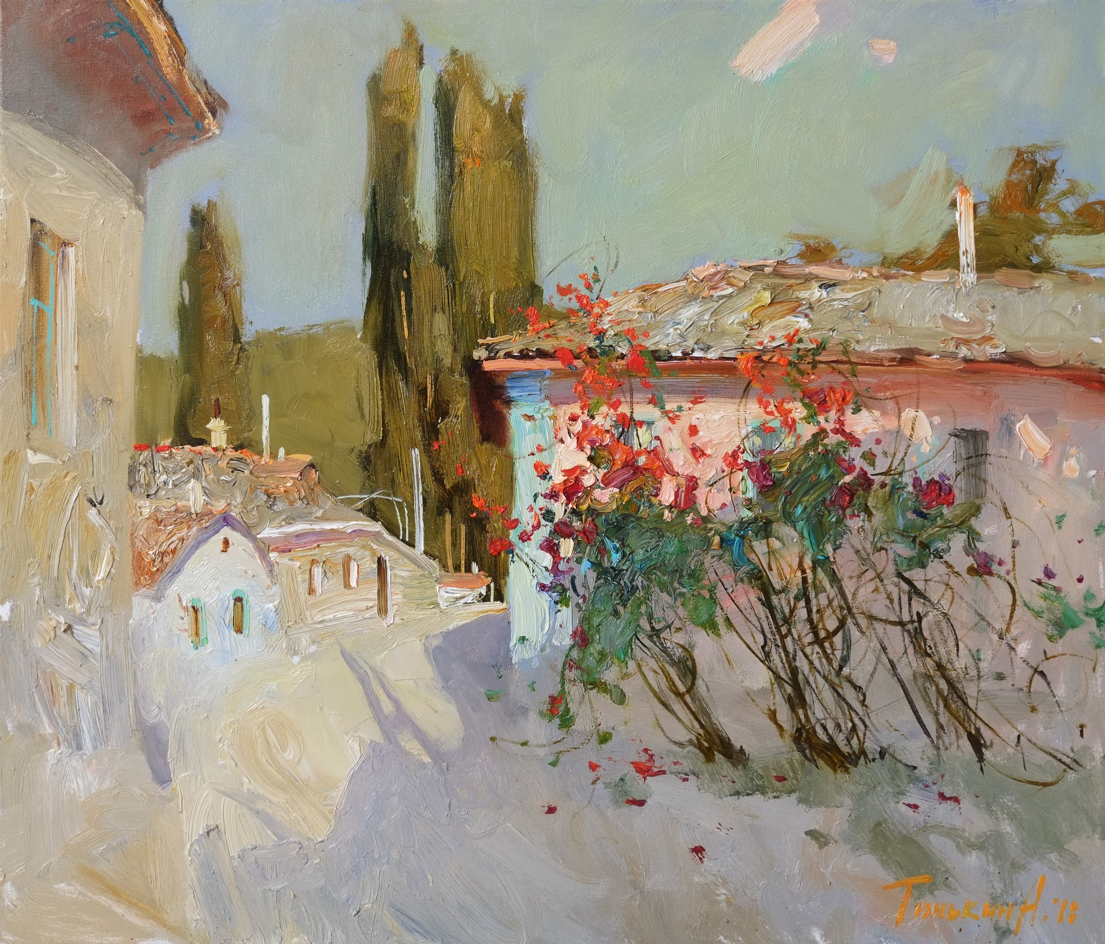 Особое очарование картине придает буйно цветущая растительность, обвивающая стены домов. Яркие красные цветы, выполненные в технике пастозного мазка, словно вспыхивают на фоне приглушенной палитры пейзажа, привлекая взгляд и вызывая восхищение. Они, словно являются символом жизни, красоты и радости, контрастируя с тишиной и покоем вечернего города.