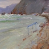 На переднем плане — берег, усыпанный камнями и галькой. Тюнькин использует энергичные мазки, чтобы передать неровную фактуру и естественный хаос. Обломки старой конструкции привносят в пейзаж человеческий элемент, напоминая о близости цивилизации, но не нарушая его первозданной красоты.