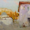 Справа возвышается здание, окутанное вечерней дымкой. Его белые стены, местами облупившиеся, рассказывают о долгой истории. Дверь распахнута, приглашая заглянуть внутрь и почувствовать дыхание времени.