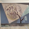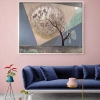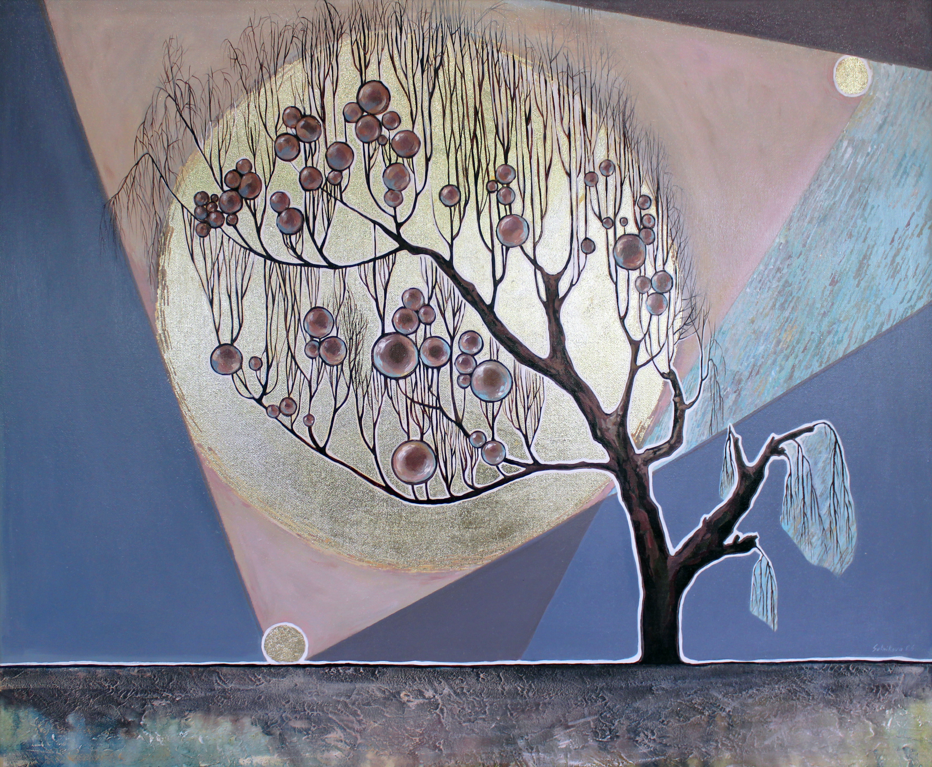 At the center of the composition stands a majestic tree with a dark, powerful trunk and delicate, slender branches. The branches embrace a large glowing golden disc, which may symbolize the sun, the moon, or some cosmic body. This disc serves as the central source of light and energy in the painting.
