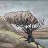 Холмистый ландшафт вокруг дерева с плавными линиями выполнен в приглушенных землистых и зеленоватых тонах. Внизу видна полоска воды, которая создает ощущение спокойствия, но в то же время может символизировать течение времени и неизбежные перемены.