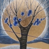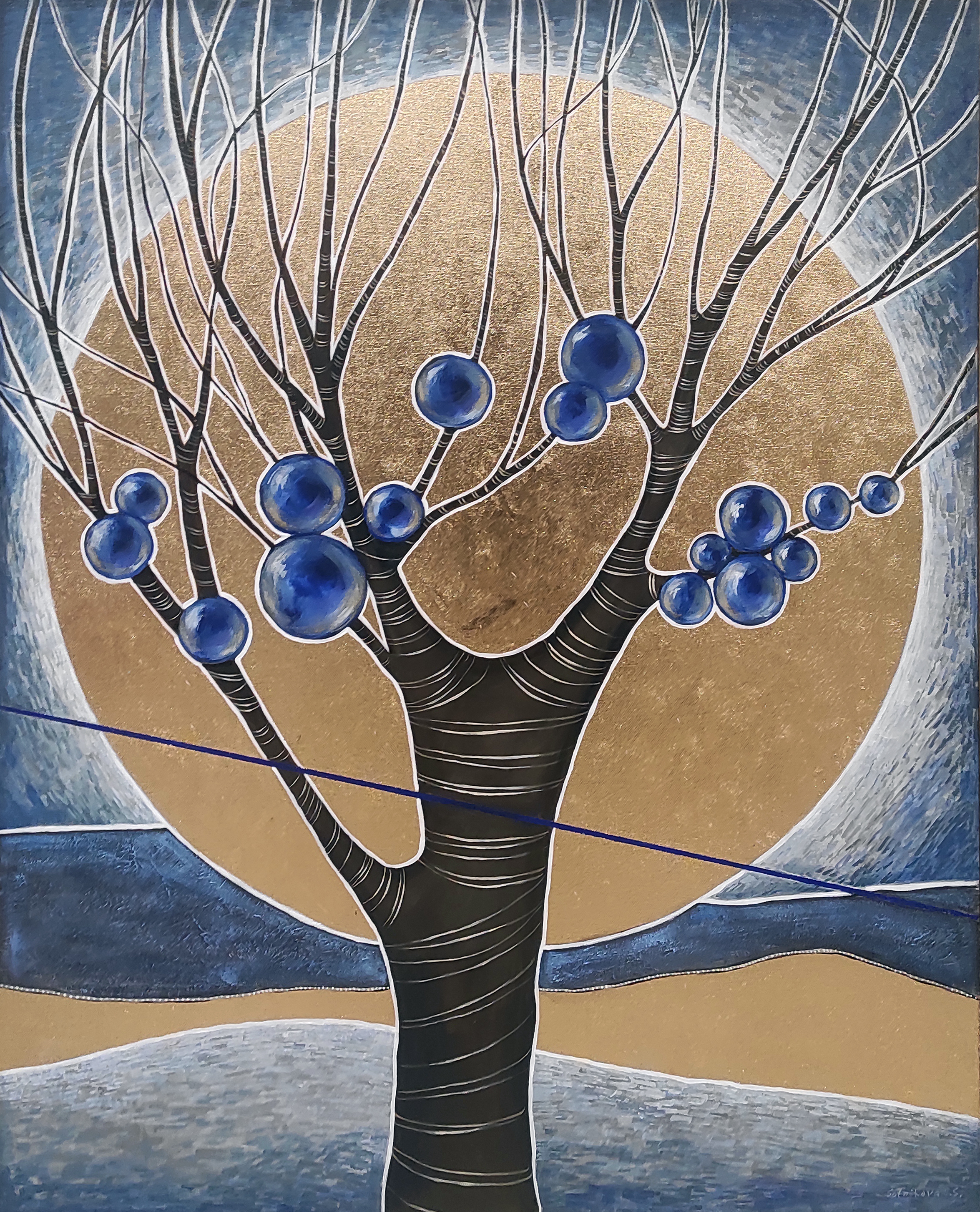 Behind the tree shines a huge golden disc, which could be the sun or a full moon. This golden background enhances the sense of wonder, warmth, and divine blessing enveloping the tree and its blue «fruits». It emphasizes the value and significance of hopes.
