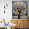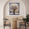 At the center of the composition stands a majestic stylized tree with a strong dark trunk and thin leafless branches. On these branches, like precious fruits, hang numerous blue spheres glowing from within. These blue orbs, especially bright and pure in color, clearly symbolize hopes, dreams, future achievements, or certain ideals that a person strives for. Their color is associated with heavenly purity and deep faith.