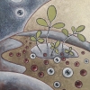 However, the surrounding environment is not so favorable. The golden soil is surrounded by gray-blue wave-like shapes and dotted with numerous eyes fixed on the shoots, as well as dark cherry-red drops resembling blood or berries. These eyes create a sense of total surveillance, pressure, or judgment.