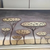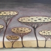 The canvas is dominated by objects resembling giant mushrooms or acacias with flat, discoid «crowns». These upper parts are richly covered in gold and speckled with dark spots, as if weighed down by the burden or experience they carry. The structure of these «trees» is lacy, resembling a delicate, exhausted web or nervous system, contrasting with the massiveness of the canopy.