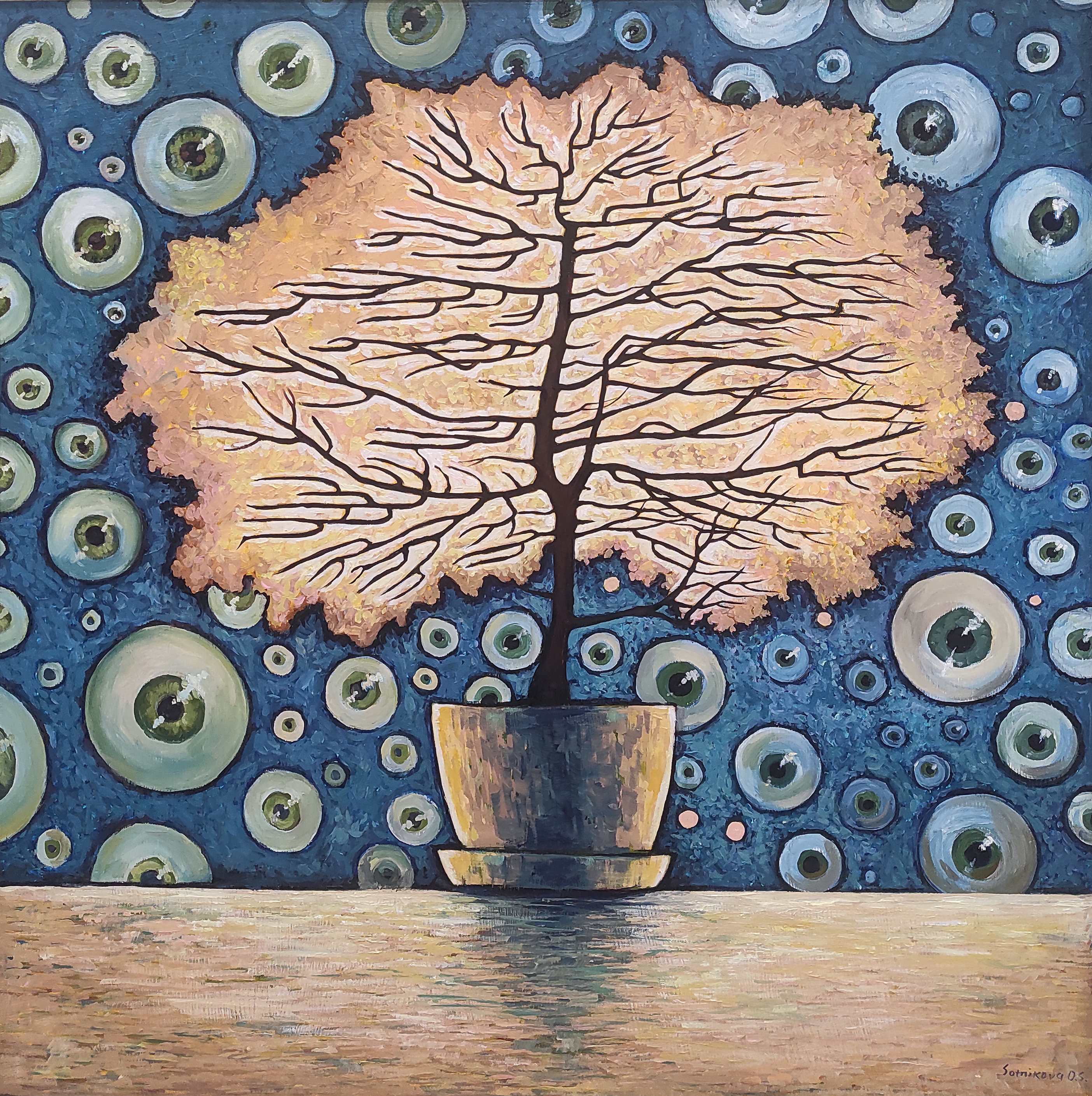 But it is the background that gives the work its drama. The entire blue-turquoise wall surrounding the tree is dotted with numerous eyes of various sizes, from tiny to large, anxiously staring directly at the subject. These «thousands of views» symbolize public opinion, constant observation, criticism, or expectations to which every developing individual is subjected.