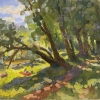 People are relaxing near the rive in Ismaylovo park during a hot summer day. Plein-air painting.