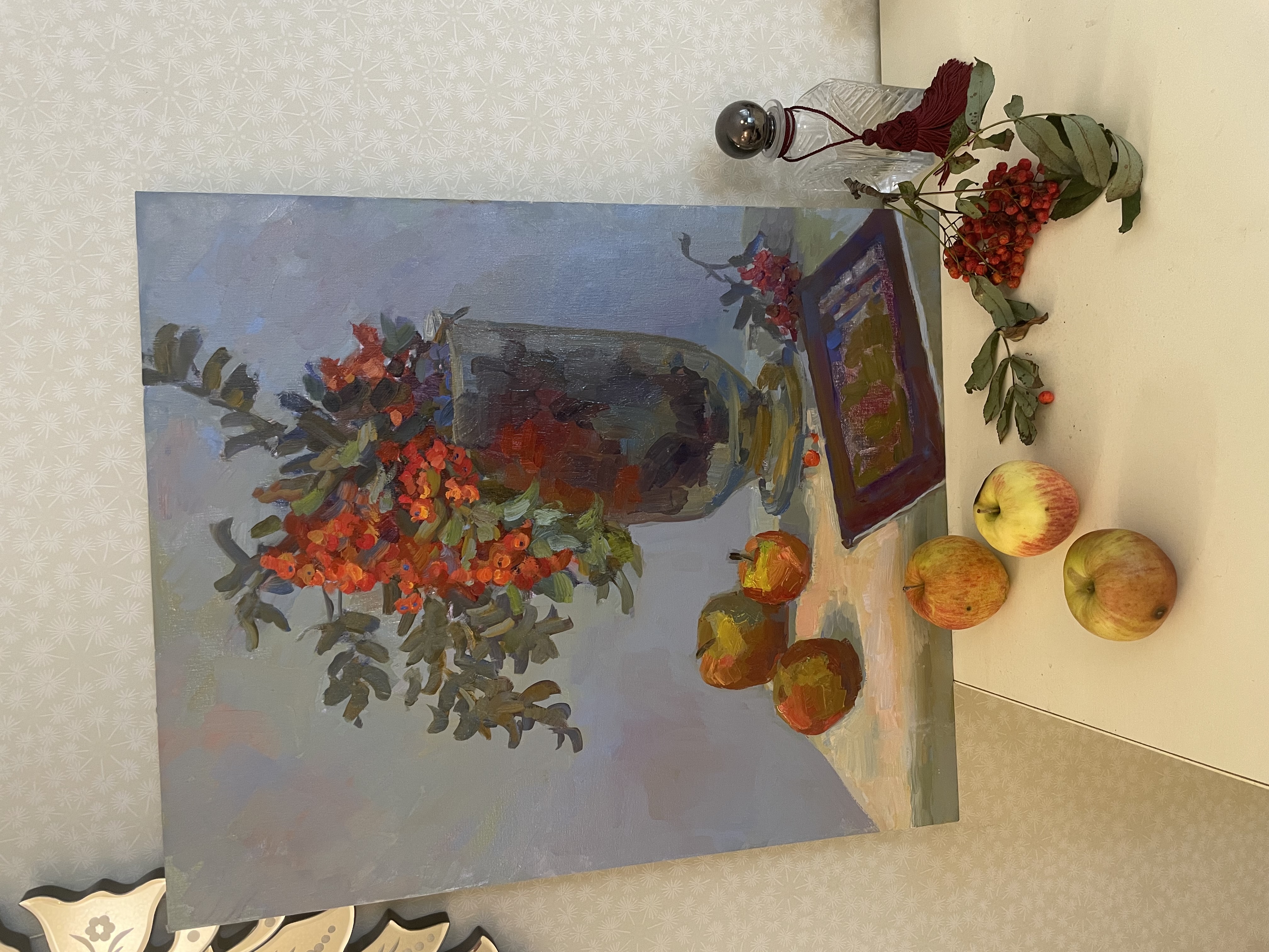 Эта оригинальная работа «Nature-morte with rowan and apples. Autumn» была создана современной российской художницей Ekaterina Tomilovskaya и доступна для покупки в интернете.