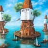 It is easier for us to travel across the city to meet friends than to spend time with people who are so close and yet so far away. That is why each house in the painting is situated on a separate island. And theoretically, there is a bridge, but crossing it is practically impossible.