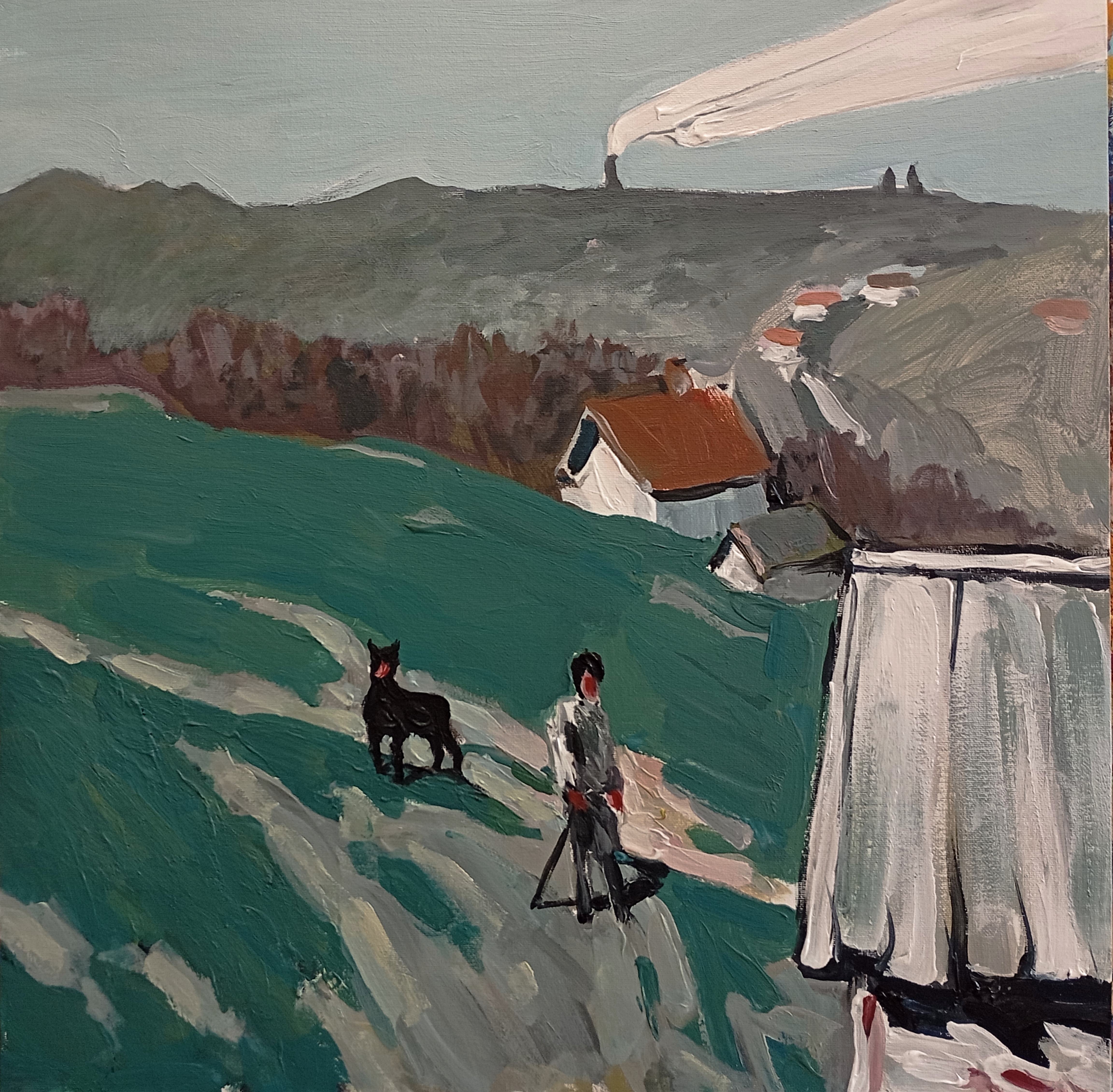 the painting is called "Outskirts. Grandfather Vasily and Doberman"