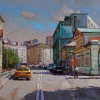 This oil painting depicts a cityscape. It depicts a sunny street surrounded by architectural structures from different eras. The facades of the buildings are painted in warm and cool shades, creating a harmonious combination of ancient and modern architecture.