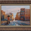 This painting depicts a cityscape bathed in the rays of the setting sun. Warm golden light reflects off the facades of old buildings, giving them a cozy glow. The artist masterfully conveys the atmosphere of a quiet evening in the city: deserted sidewalks, a few cars on the road, slight moisture on the asphalt creating reflections.