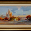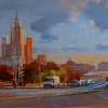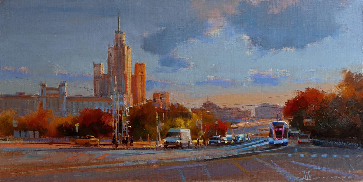 This painting depicts a cityscape in warm golden and soft blue tones, creating the atmosphere of a calm autumn evening. In the center of the composition stands a tall building in the Stalinist Empire style, which is drowning in the rays of the setting sun, giving it a majestic and slightly nostalgic look.