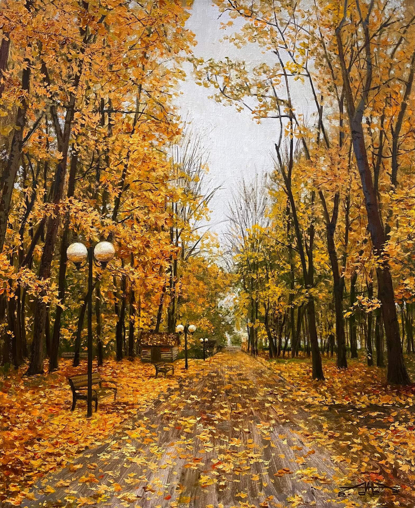 Композиция картины выстроена таким образом, что взгляд зрителя плавно скользит вглубь парковой аллеи, усыпанной опавшими листьями. Деревья, растущие по обеим сторонам дорожки, создают ощущение глубины и перспективы, словно приглашая окунуться в атмосферу осеннего великолепия.