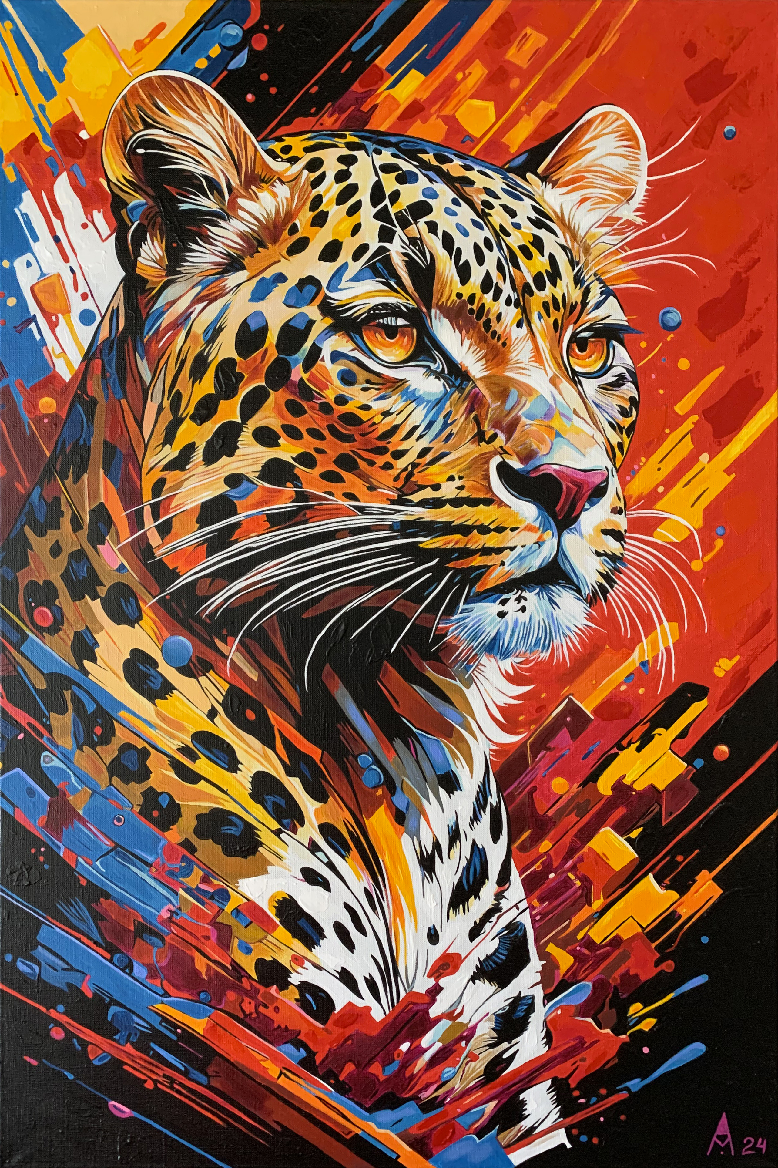 A painting from the series "Bright Portraits of Red-Listed Animals." As an animal artist, I strive to draw the viewer's attention to the issue of rare and endangered species. In this series, the red color references the Red Book, the portrait is composed of dynamic paint spots, and the geometry emphasizes the fragility of the animal world.