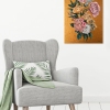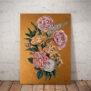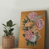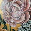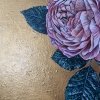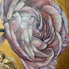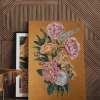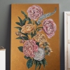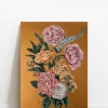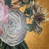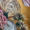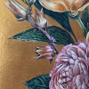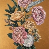 Rough, voluminous golden strokes in the background emphasize the elegance and refinement of peonies and roses.