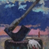 Небо над пейзажем — тёмное и грозовое, словно предвещающее бурю. Нависшие над землёй облака создают ощущение тревоги и надвигающейся катастрофы.