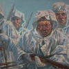 В центре композиции — группа лыжников, одетых в белые маскировочные костюмы. Их измученные и обветренные лица выражают решимость и готовность выполнить свой долг. Фигуры солдат словно сливаются с заснеженным пейзажем, что создаёт ощущение их невидимости и неуловимости.