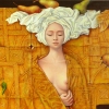 The background of the painting is done in warm golden-ochre tones and resembles an ancient mosaic, dotted with geometric patterns and cracks. This design creates a sense of a fracture in reality, as if the woman's figure is emerging from another plane.