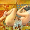 The painting "Sublimation" is a surprising combination of classical sensuality and abstract expression. The canvas depicts a naked woman curled up in a fetal position. Her body seems to merge with the background, which consists of warm golden and ochre shades, complemented by ornamental elements. The ruptures and the effect of aged canvas create the impression of time dissolving the boundaries between reality and art.