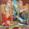 This painting is executed in a surreal and symbolic style, filled with mysterious images and refined details. The composition is built around two figures - a man and a woman - dressed in medieval or Renaissance clothing with bright, rich patterns. Their headdresses are decorated with pomegranates and apples, which can symbolize fertility, wisdom or forbidden knowledge.