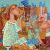 The painting "Painted City" depicts a fantasy city filled with warm and cool shades, creating a sense of magic and fairytale. In the foreground are two figures - a woman in a light patterned dress and a man immersed in conversation. Their faces are stylized, and the proportions are slightly distorted, which gives the work a special artistic style.