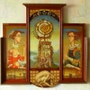 The two side panels are portraits of two feminine figures dressed in fantasy outfits reminiscent of Renaissance clothing. On the left is a woman in red holding a small snail, reflecting the symbolism of the central element. On the right is a woman in blue and gold armor, which can be associated with the image of a guardian or a warrior. Their looks are filled with mystery, as if they carry secret knowledge.