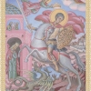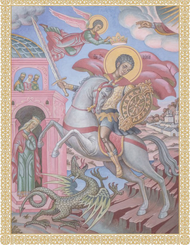 В центре композиции, как и положено, возвышается святой Георгий — могучий всадник, облачённый в сверкающие золотые доспехи. Он восседает на белоснежном коне, чья грациозная поза полна энергии и готовности к действию. Под копытами коня извивается поверженный дракон — воплощение зла, хаоса и тьмы. Меч Георгия занесен для последнего, решающего удара, но на лице святого нет ни злобы, ни ненависти. Он спокоен и сосредоточен, его взгляд устремлён вперёд, словно он видит не только поверженного монстра, но и будущее, в котором добро окончательно восторжествует. Нимб над головой Георгия сияет ярким золотым светом, подчёркивая его святость и божественное предназначение.