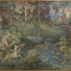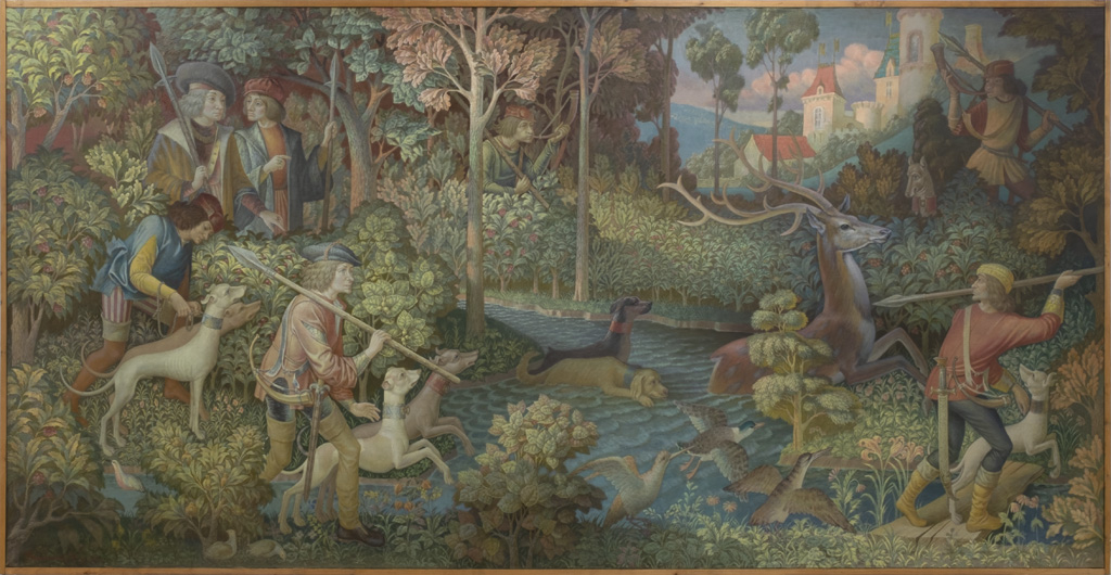 В центре композиции – группа охотников, пробирающихся сквозь густой лес в поисках единорога. Их фигуры, одетые в средневековые костюмы, кажутся немного застывшими и нереальными, словно сошедшими со страниц старинной книги. Охотники, словно ведомые непреодолимой силой, продолжают свой путь, несмотря на трудности и опасности.