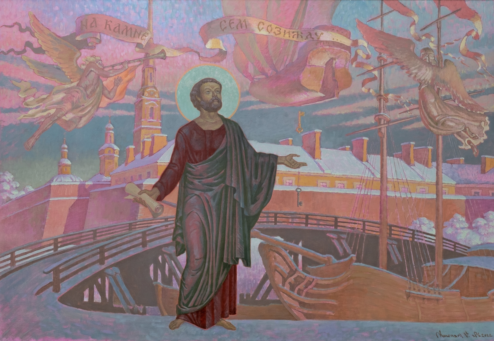 В центре композиции – фигура апостола Петра, возвышающаяся над городским пейзажем. Его поза, величественная и торжественная, выражает силу веры и непоколебимость духа. Одеяние его, стилизованное и украшенное сложным орнаментом, добавляет в образ элемент торжественности и божественного величия.
