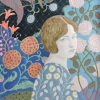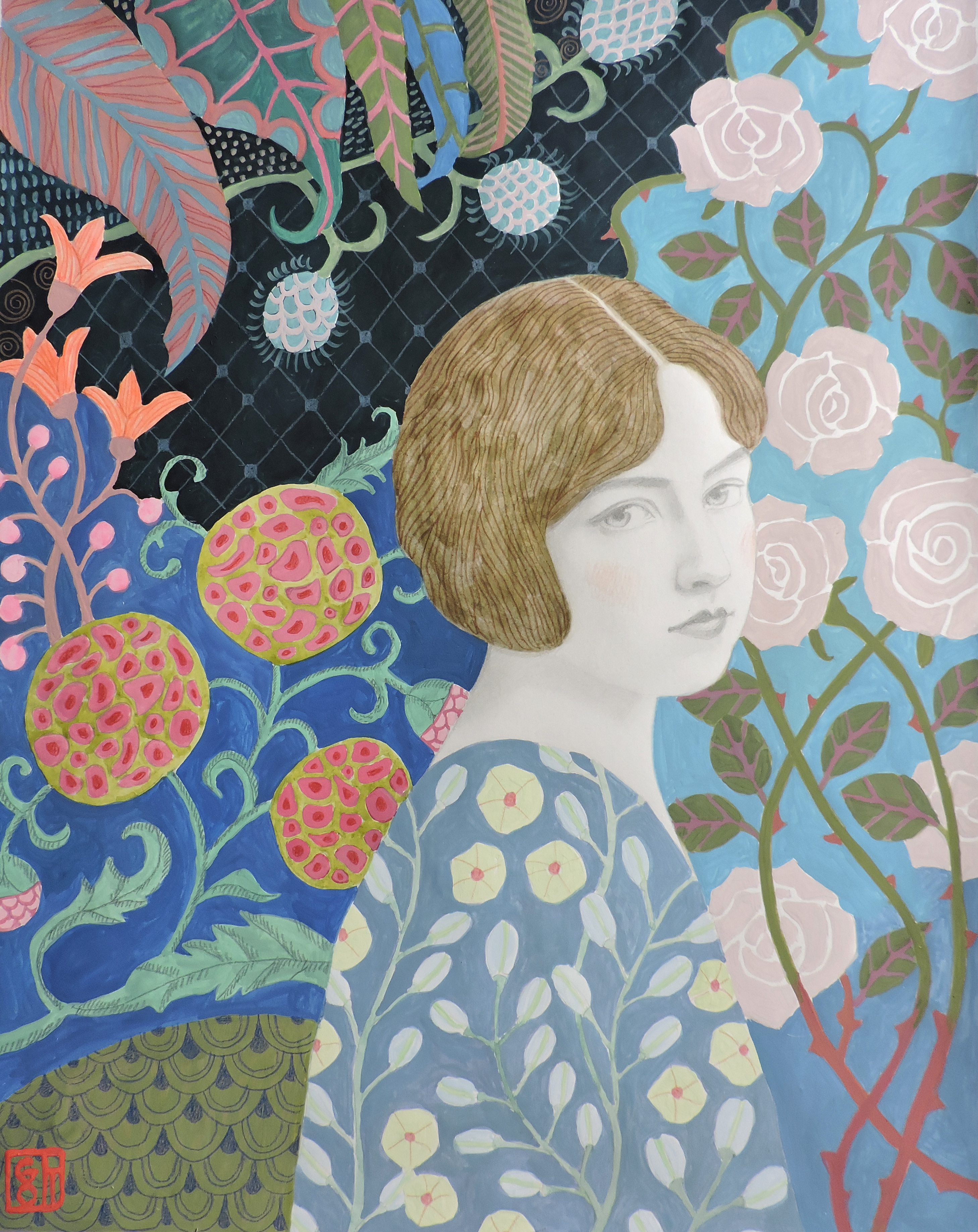 Entwining rose. Portrait of a girl against the background of decorative plant elements, flowers.