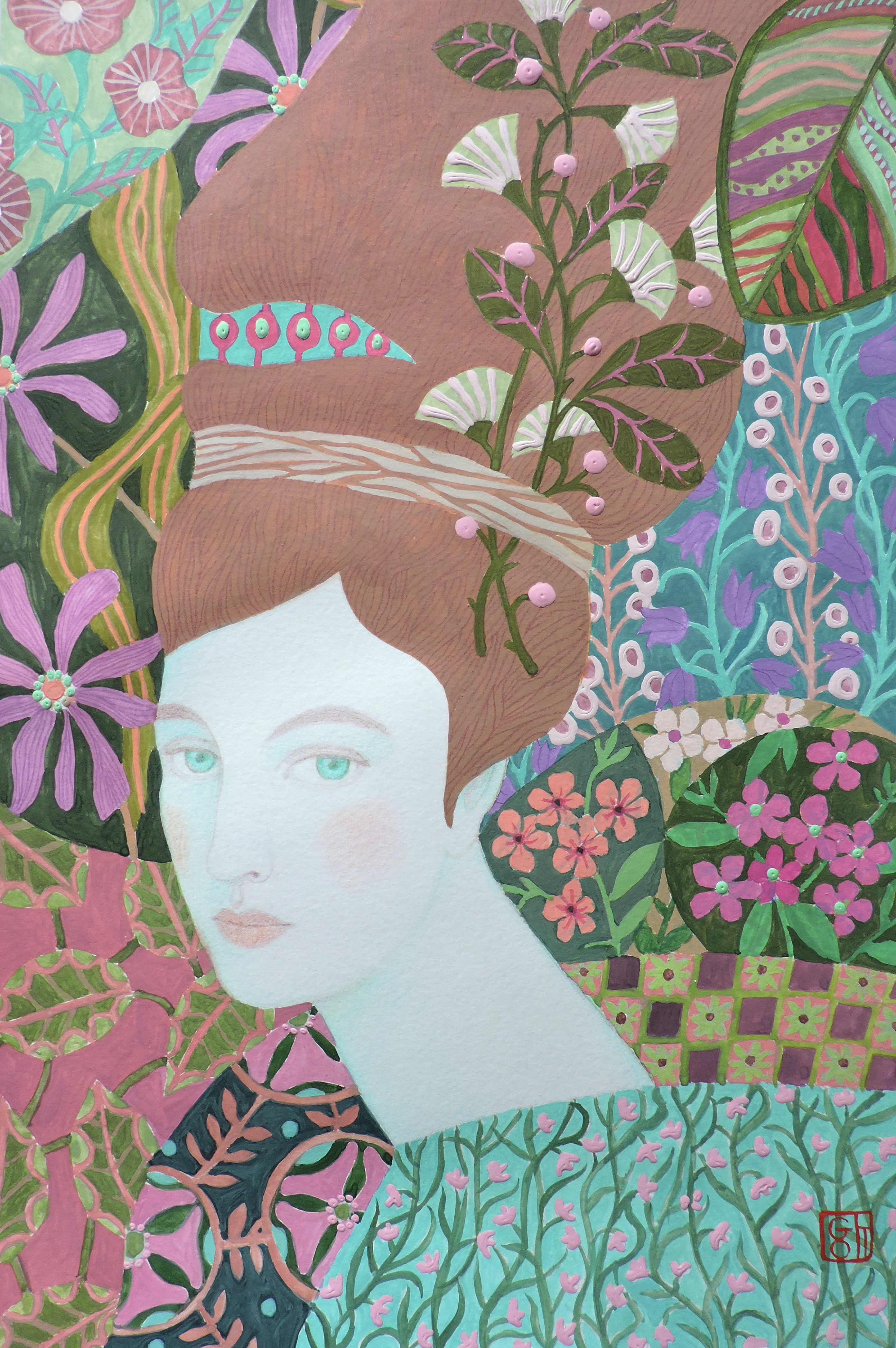 At the center of the composition is a female face rendered in a soft pastel palette, contrasting with the riot of colors in the background. The woman's light blue or greenish eyes look straight ahead, expressing calm confidence. Her hair is styled in a tall, intricate updo that becomes part of the plant ornament: twigs with pink beads and stylized white flowers with fan-shaped petals are woven into it.